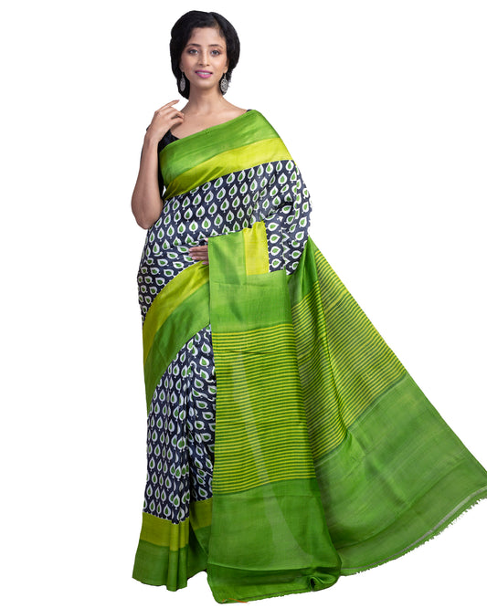 Green Black Hand Printed Pure Silk Mark Certified Bishnupuri Silk Sarees