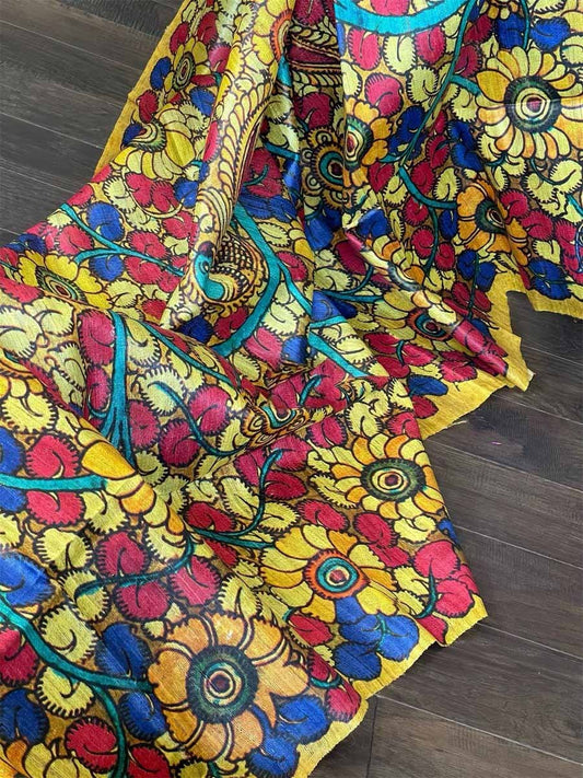 Dandelion Yellow And MultiColour Hand Painted Pure Pure Silk Mark Certified Kalamkari Tussar Silk Sarees