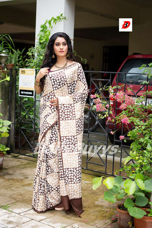 Beige Brown Block Printed Pure Silk Mark Certified Bishnupuri Silk Sarees