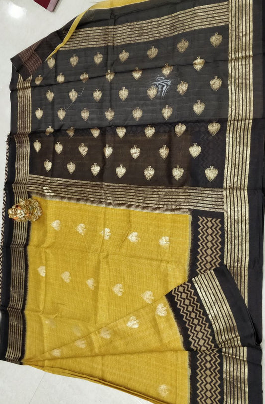 Black Yellow Pure Linen Sarees