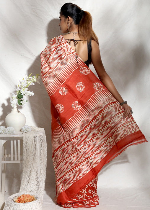 Orange Block Print Silk Mark Certified Bishnupuri Silk Sarees