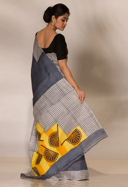 Mustard Yellow Block Printed Pure Silk Mark Certified Tussar Silk Sarees