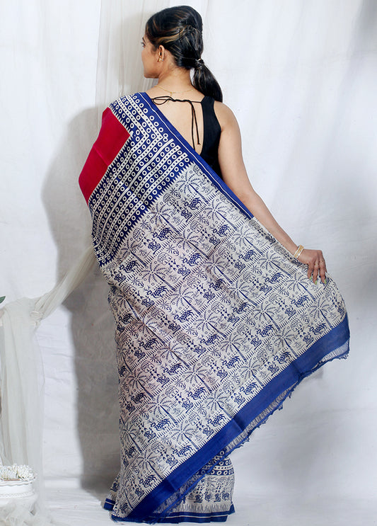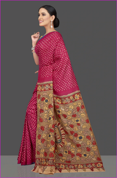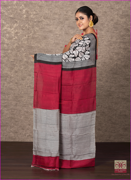 Red Block & Hand Painted Kalamkari Silk Mark Certified Bishnupuri Silk Sarees