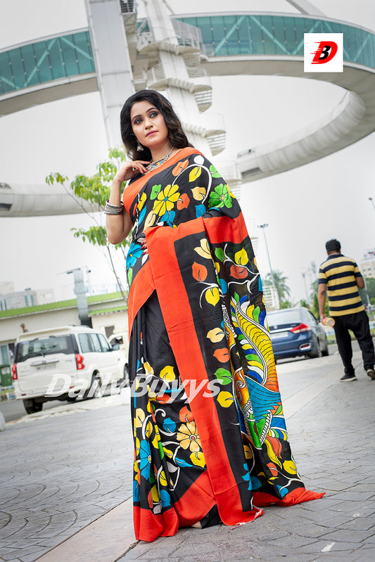 Black Hand Painted Floral Motif Pure Bengal Pure Silk Mark Certified Kalamkari Tussar Silk Sarees