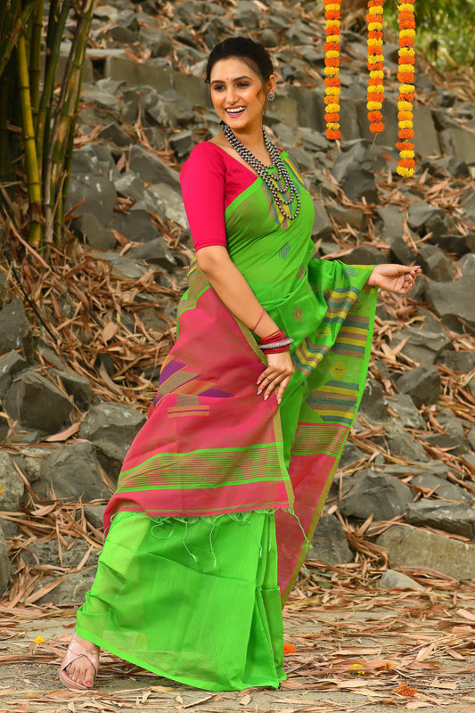 Green And Magenta Rose Printed Pure Pure Cotton Pure Pure Cotton Dhakai Jamdani Sarees