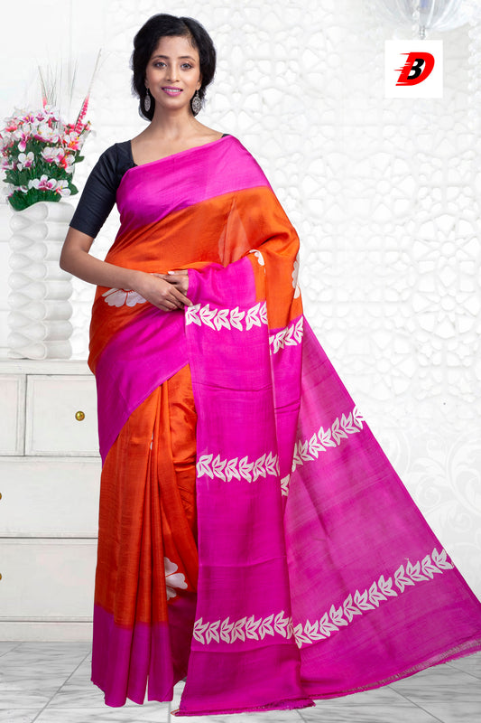 Orange Pink Zari KK Block Printed Zari Border Pure Silk Mark Certified Tussar Silk Sarees