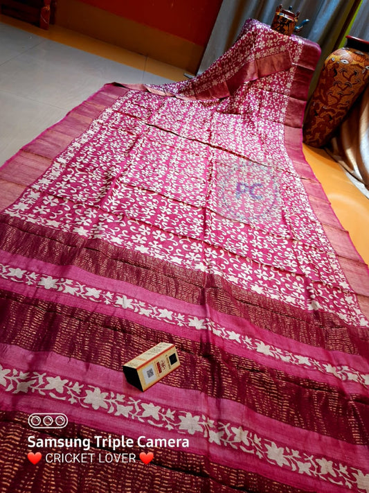 Rani Block Print Zari Border Pure Silk Mark Certified Tussar Silk Sarees