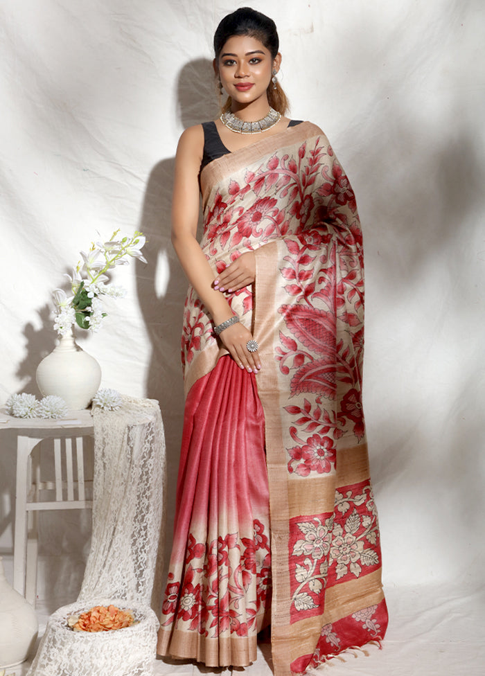 Red Beautiful Hand Paited Zari Border Pure Silk Mark Certified Tussar Silk Sarees