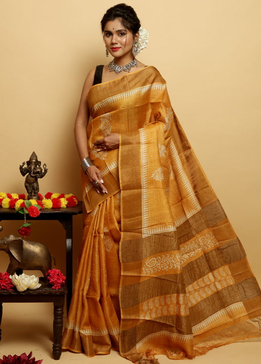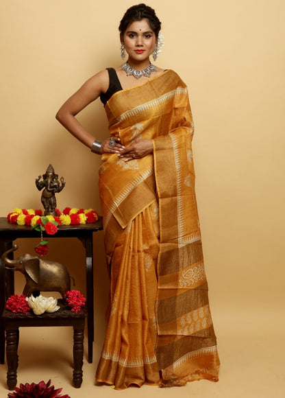 Yellow Block Print Zari Border Pure Silk Mark Certified Tussar Silk Sarees