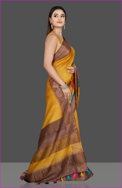 Yellow Floral Hand Painted Zari Border Pure Silk Mark Certified Tussar Silk Sarees