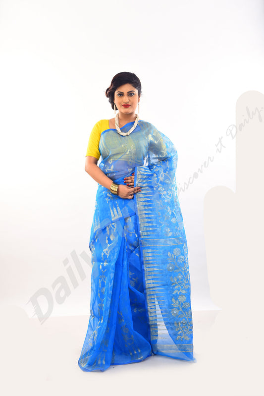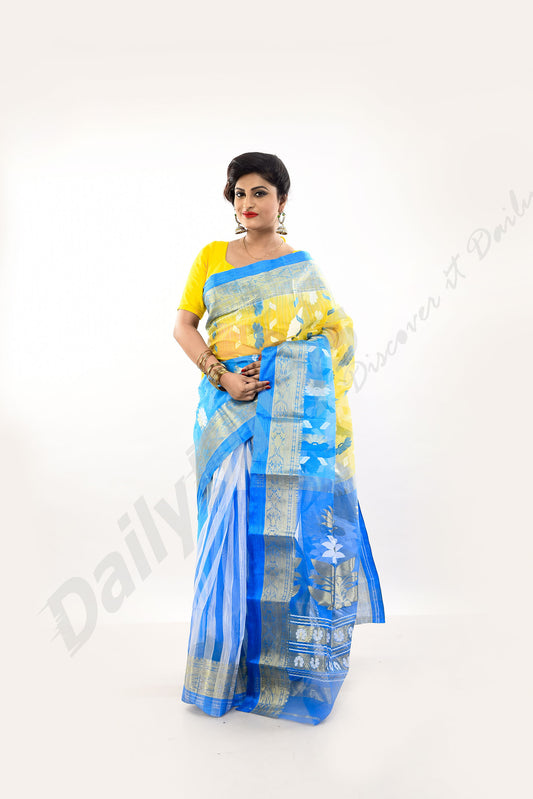 Blue Golden White Flower Dhakai Jamdani Sarees