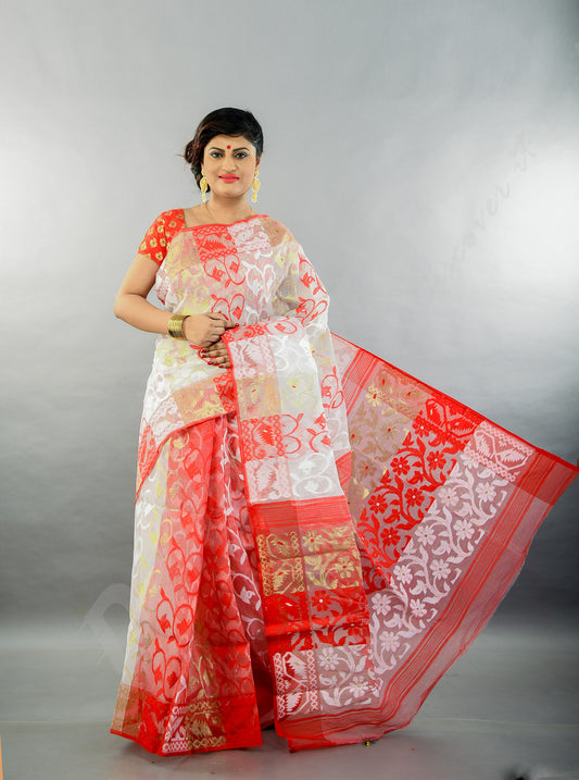 Red Cotton Handloom Jamdani Sarees (Add to Cart Get 15% Extra Discount