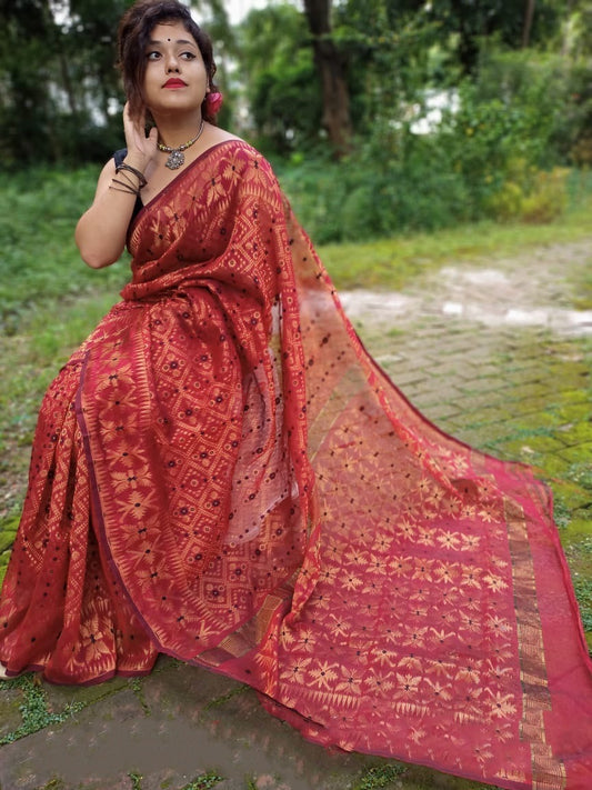 Maroon Matka Silk Mark Certified Muslin Jamdani Sarees