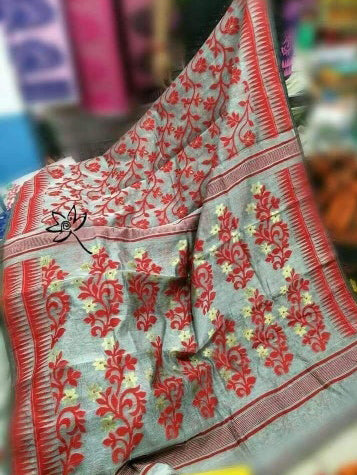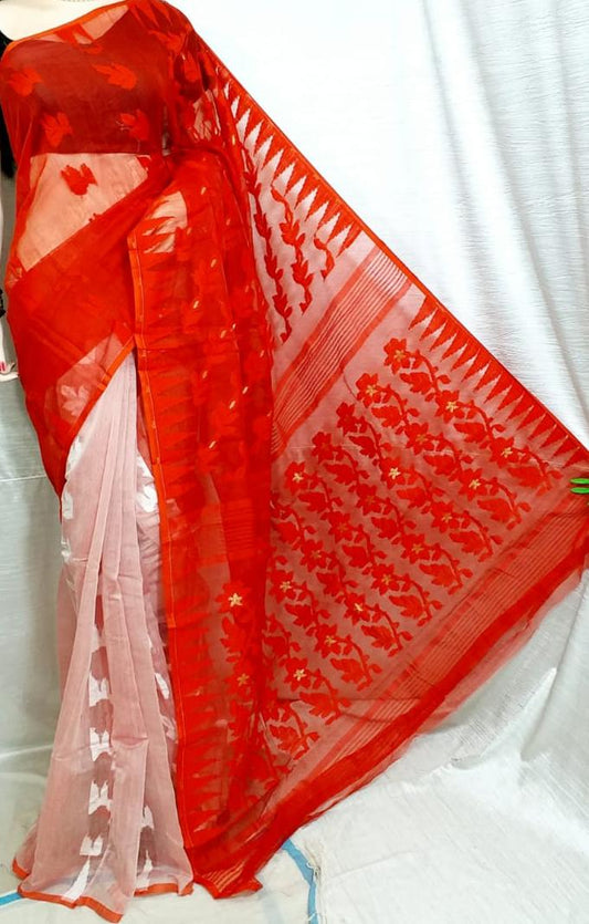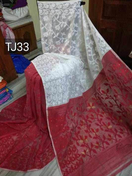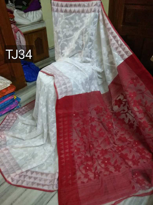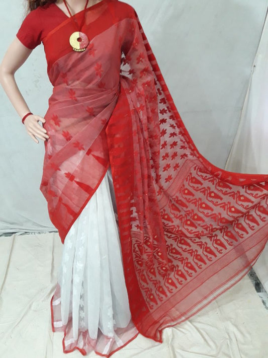 White & Red Cotton Handloom Jamdani Sarees (Add to Cart Get 15% Extra Discount