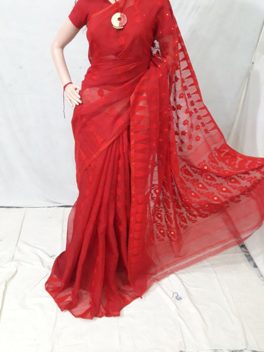 Red Cotton Handloom Jamdani Sarees (Add to Cart Get 15% Extra Discount