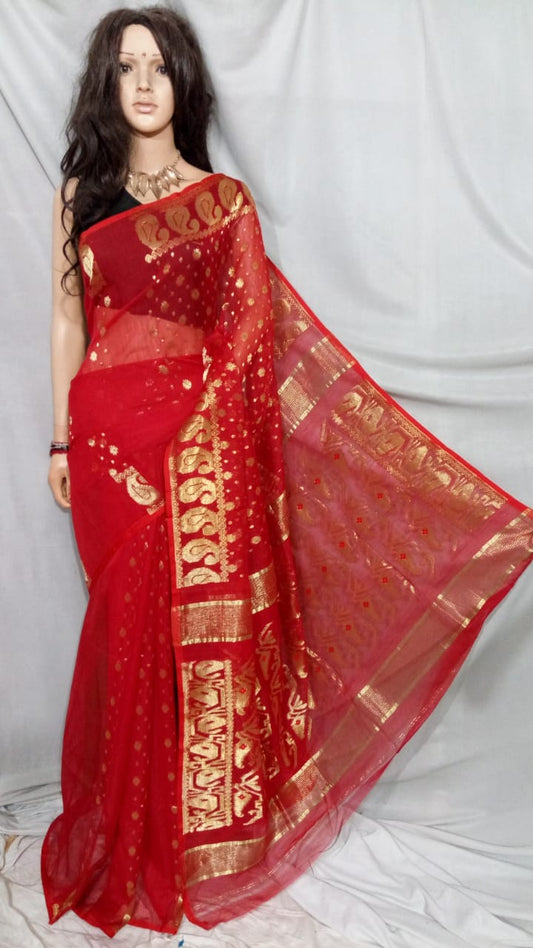 Red Matka Silk Mark Certified Muslin Jamdani Sarees