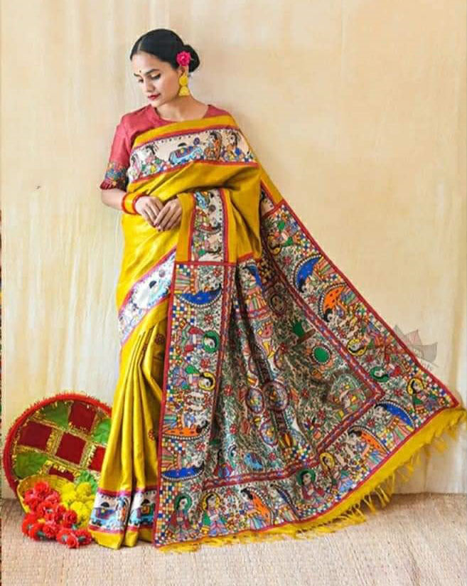 Yellow Printed Pure Silk Mark Certified Tussar Ghicha Silk Sarees