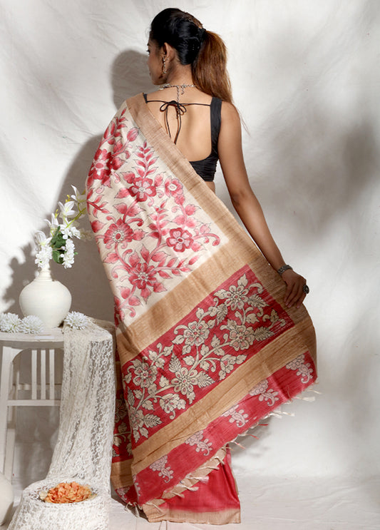 Red Beautiful Hand Paited Zari Border Pure Silk Mark Certified Tussar Silk Sarees
