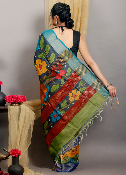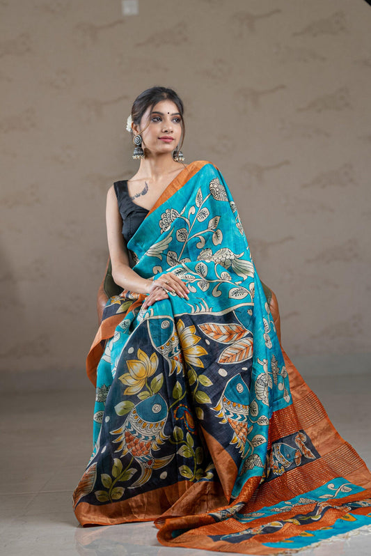 Blue Multi Color Hand Painted Pure Silk Mark Certified Kalamkari Tussar Silk Sarees