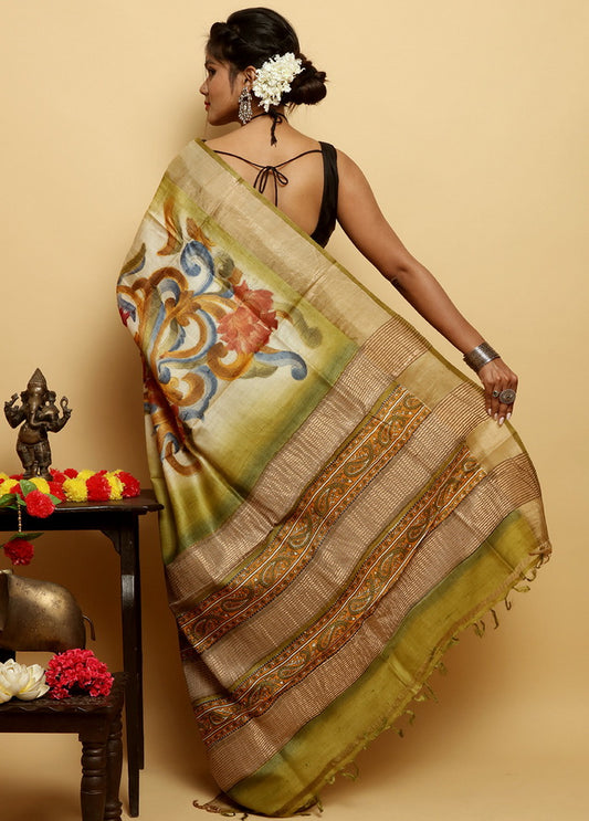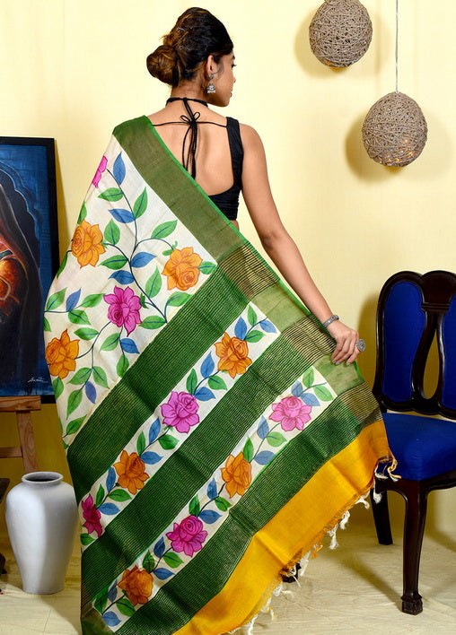 Geeen Floral Hand Painted Zari Border Pure Silk Mark Certified Tussar Silk Sarees