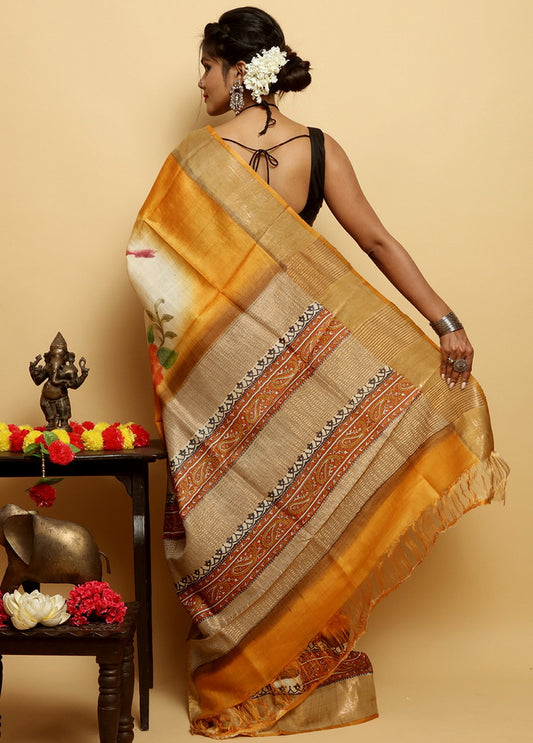 Yellow Beautiful Hand Paited Zari Border Pure Silk Mark Certified Tussar Silk Sarees