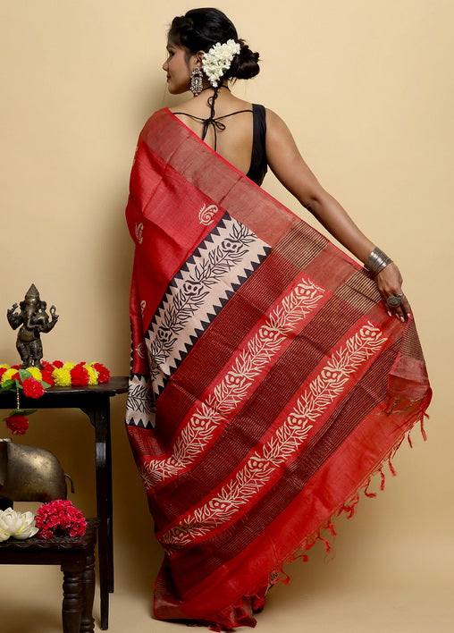 Red Wax Batik Hand Painted Pure Silk Mark Certified Tussar Silk Sarees