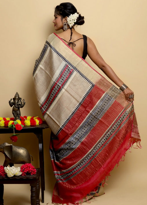 Red Block Print Zari Border Pure Silk Mark Certified Tussar Silk Sarees