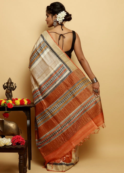 Orange Block Print Zari Border Pure Silk Mark Certified Tussar Silk Sarees