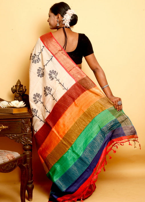 Beige Hand Painted Pure Silk Mark Certified Tussar Silk Sarees