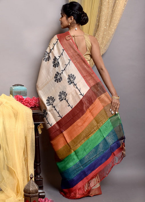 Beige Block Printed Zari Border Pure Silk Mark Certified Tussar Silk Sarees