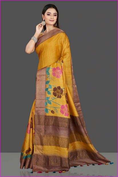 Yellow Floral Hand Painted Zari Border Pure Silk Mark Certified Tussar Silk Sarees
