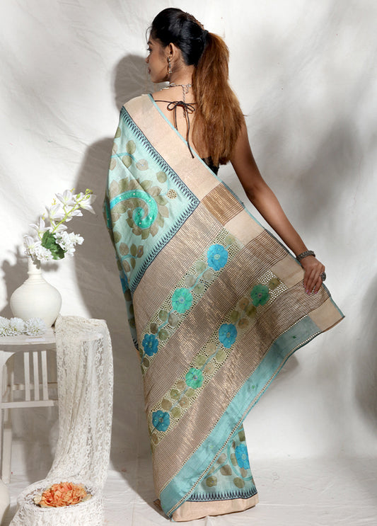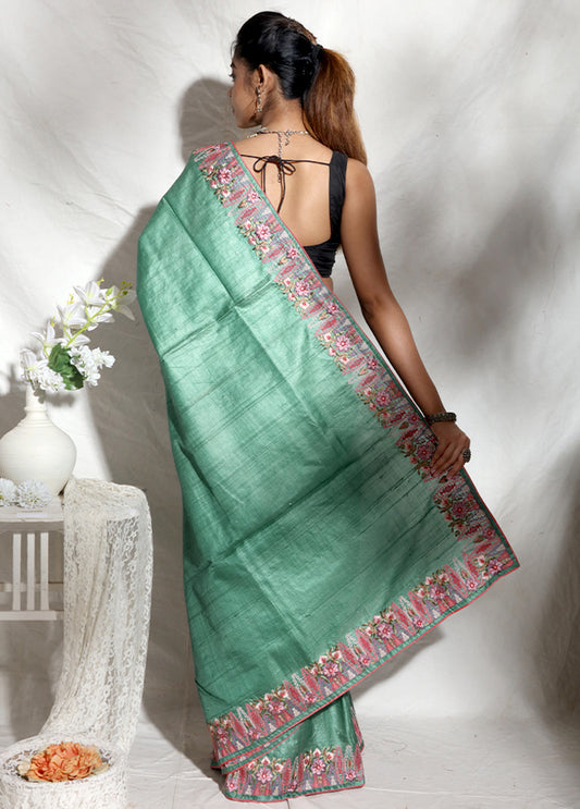 Embroidery Work Teal Color Pure Silk Mark Certified Tussar Silk Sarees