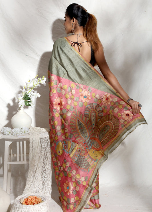 Green Hand Painted Pure Silk Mark Certified Kalamkari Tussar Silk Sarees