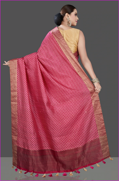 Pink Wax Batik Hand Painted Zari Border Pure Silk Mark Certified Tussar Silk Sarees
