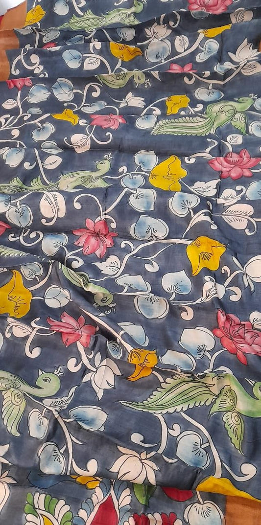 Slate Coloured Multi Colour Pure Silk Mark Certified Kalamkari Tussar Silk Sarees