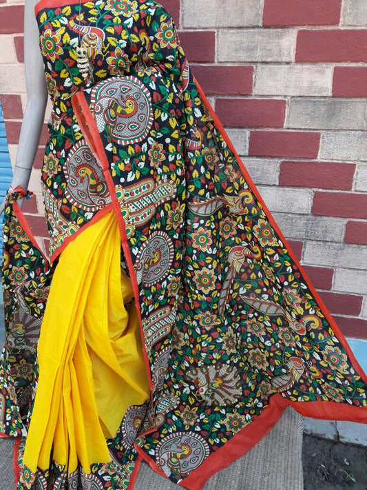 Yellow Black Pure Silk Mark Certified Kalamkari Tussar Silk Sarees