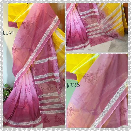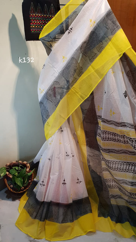 Yellow And Red Block Printed Pure Pure Cotton KK Kota Doriya Sarees