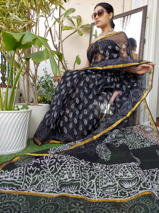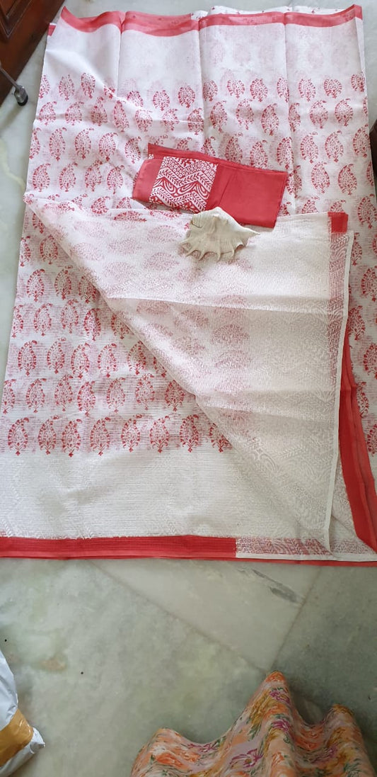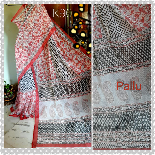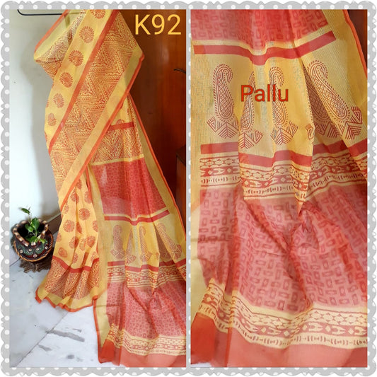 Most Kota Doria or Kota Doriya saris are made on power looms in Surat and Varanasi and may be hand block printed, embroidered or hand finished in a variety of ways. The fabric is also used as dress fabric and for stoles and dupattas.