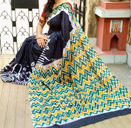 Peach and Black Pure Mulmul Handloom Batik Sarees