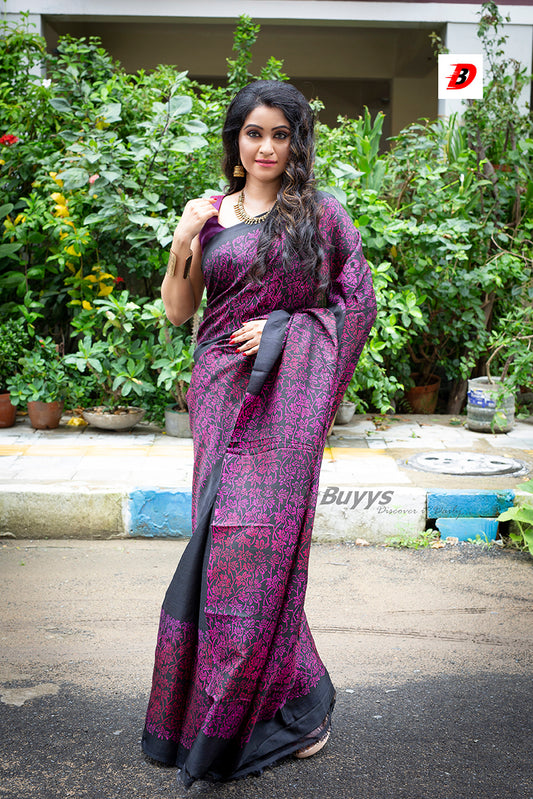Black Violet Block Printed Pure Silk Mark Certified Bishnupuri Silk Sarees
