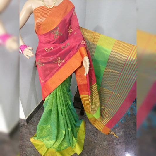 Orange Kantha Stitch Design Dupion Silk Sarees