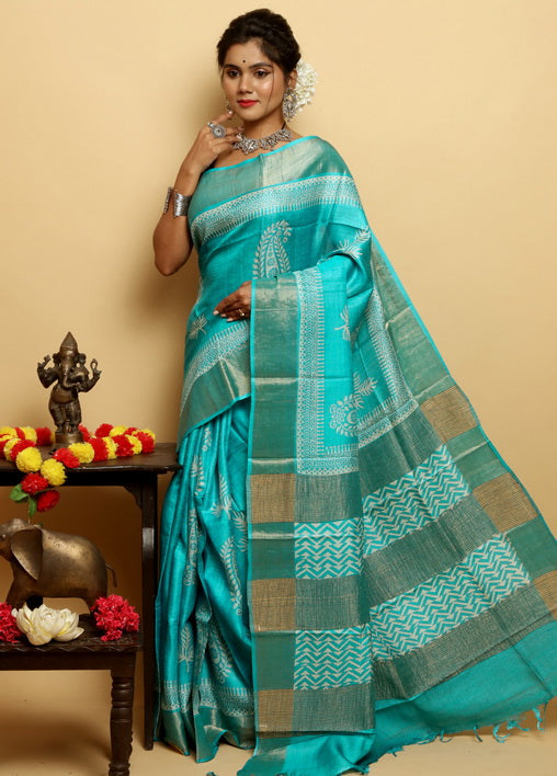 Blue Block Printed Zari Border Pure Silk Mark Certified Tussar Silk Sarees