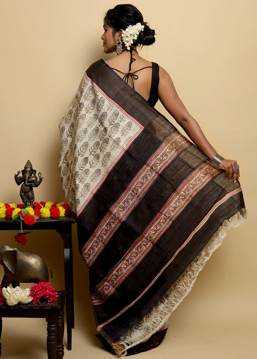 Black Beige Block Printed Plain Pure Silk Mark Certified Tussar Silk Sarees