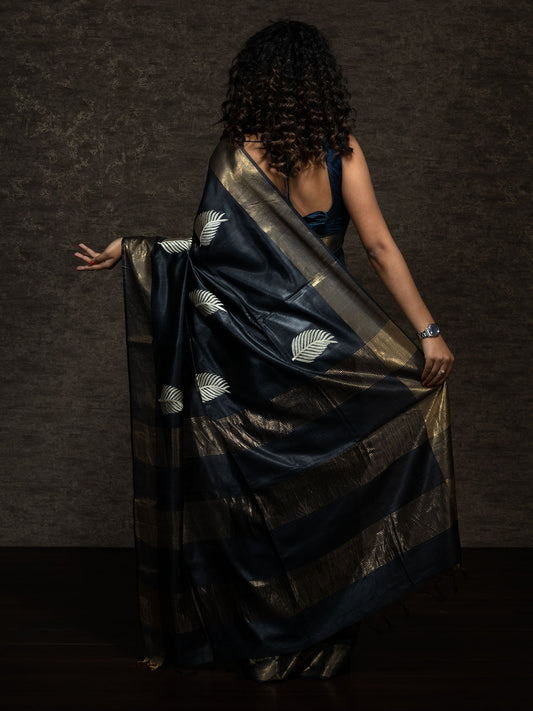 Black Hand Printed Plain Pure Silk Mark Certified Tussar Silk Sarees