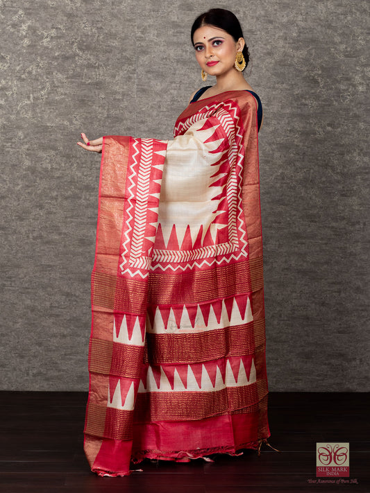 Beige Red Zari Border Block Printed Pure Silk Mark Certified Tussar Silk Sarees