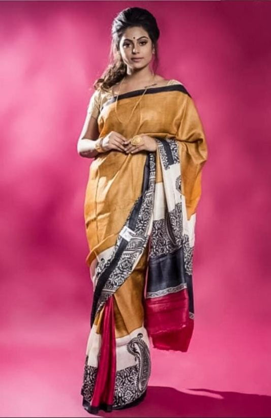 Block Printed Pure Silk Mark Certified Tussar Silk Sarees