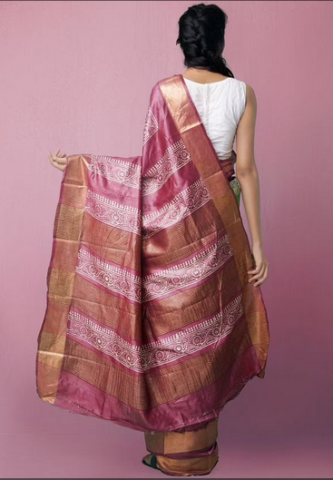 Block Printed Zari Border Pure Silk Mark Certified Tussar Silk Sarees