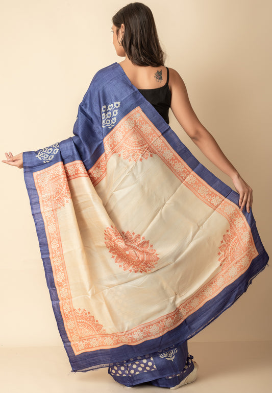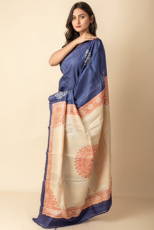 Blue Hand Block Printed Silk Mark Certified Tussar Silk Saree