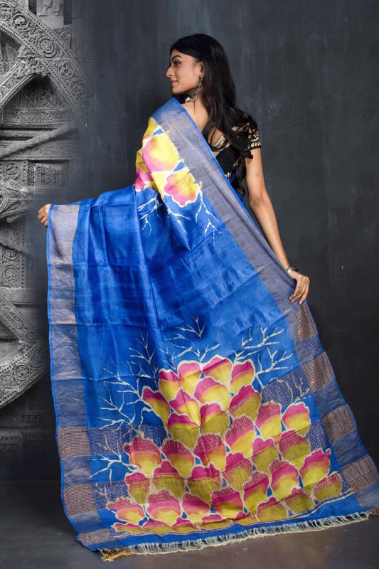 Blue Hand Painted Pure Silk Mark Certified Tussar Silk Sarees
