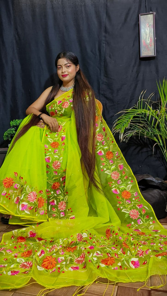 Neon Green Pure Reshom Silk Mark Certified Muslin Embroidered Saree